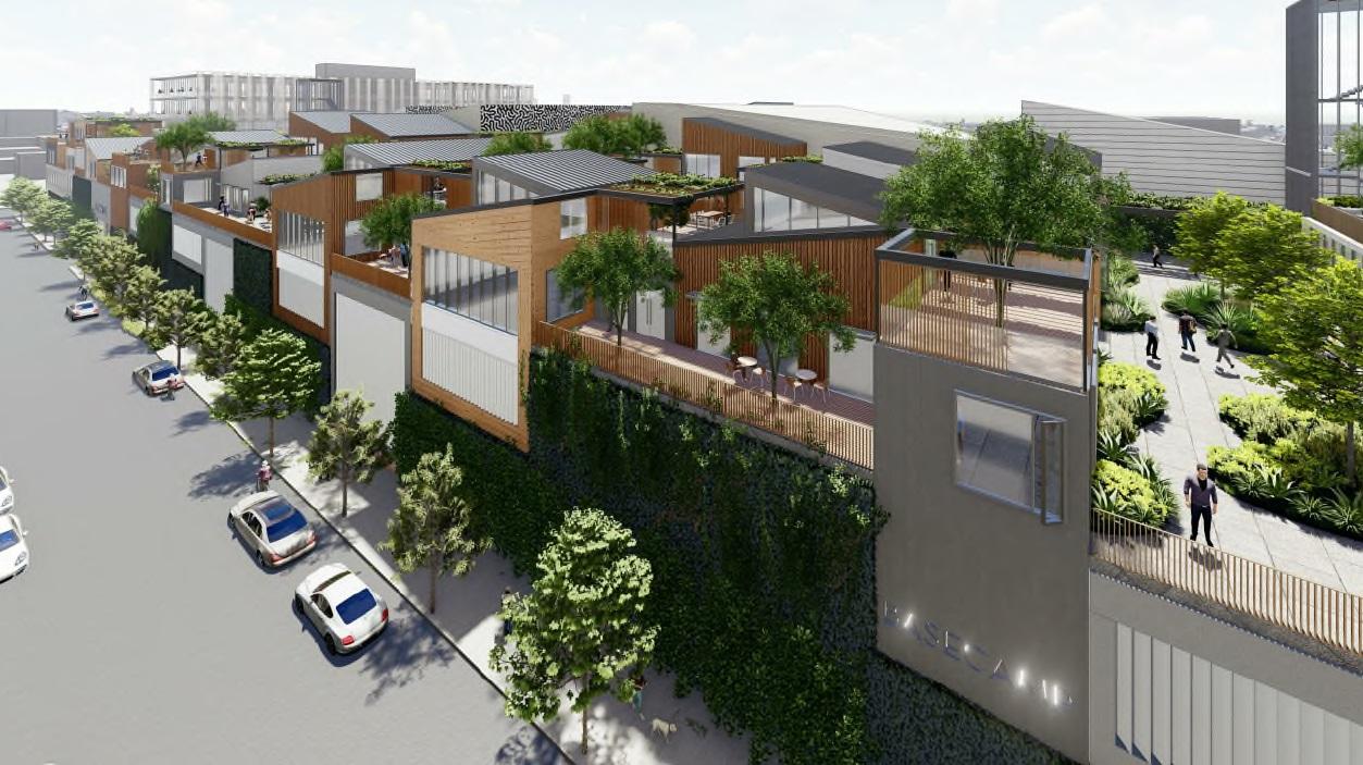 A former department store site along Santa Monica Boulevard is being redeveloped into a large-scale studio and office campus spanning an entire city block in Hollywood. The project, proposed for 5601 Santa Monica Boulevard, replaces a former Sears building with a mixed-use complex combining production facilities, office space, and ground-floor commercial uses.