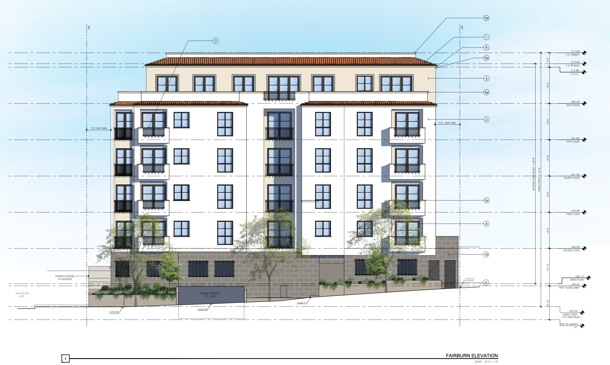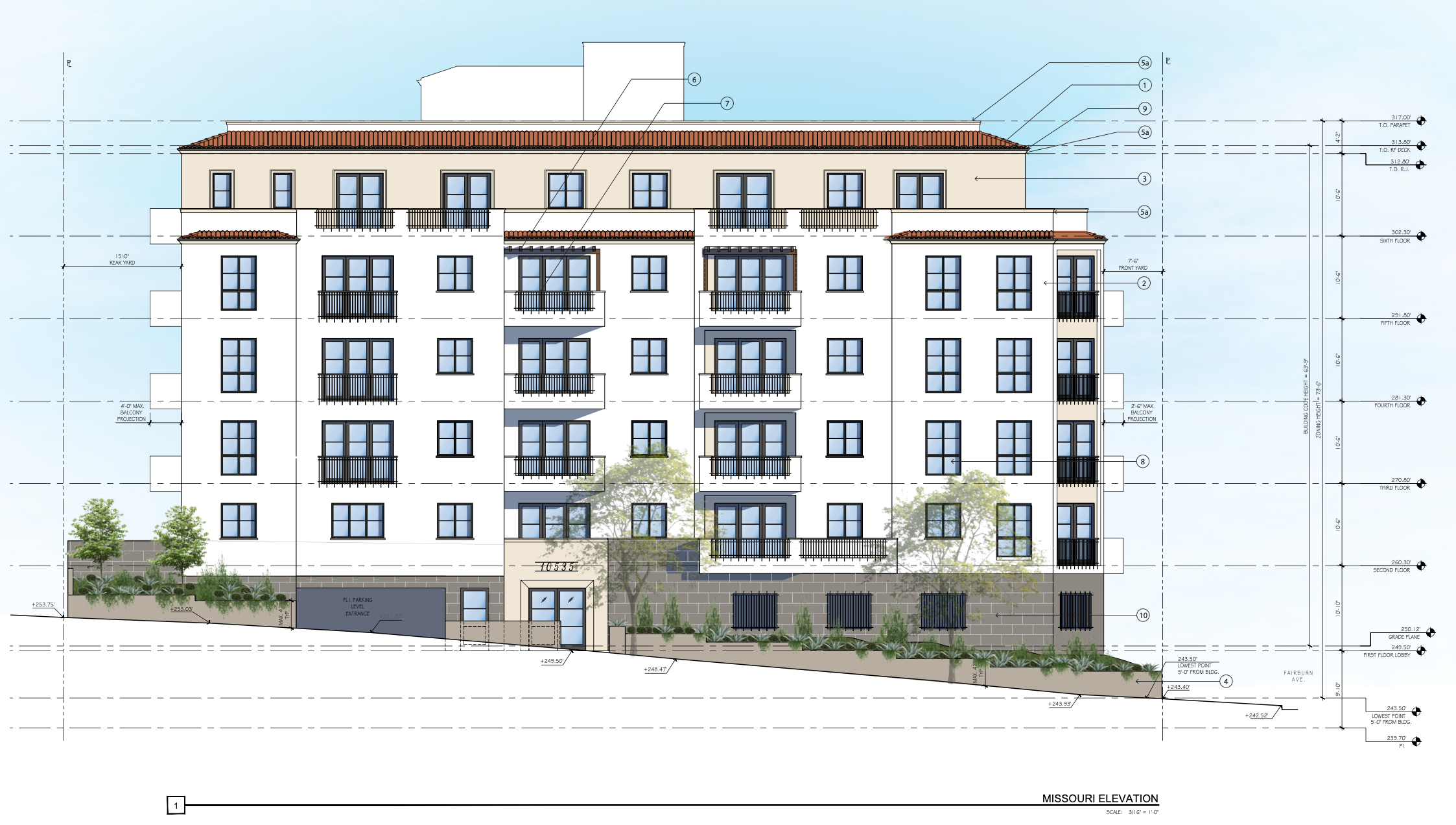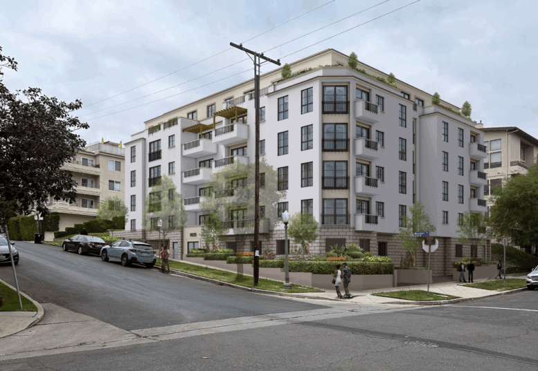 A new six-story apartment building is planned at 10535 West Missouri Avenue in West Los Angeles, where a duplex and a single-family residence currently stand. The proposed development would rise at the northeast corner of Missouri Avenue and Fairburn Avenue, just south of Santa Monica Boulevard.