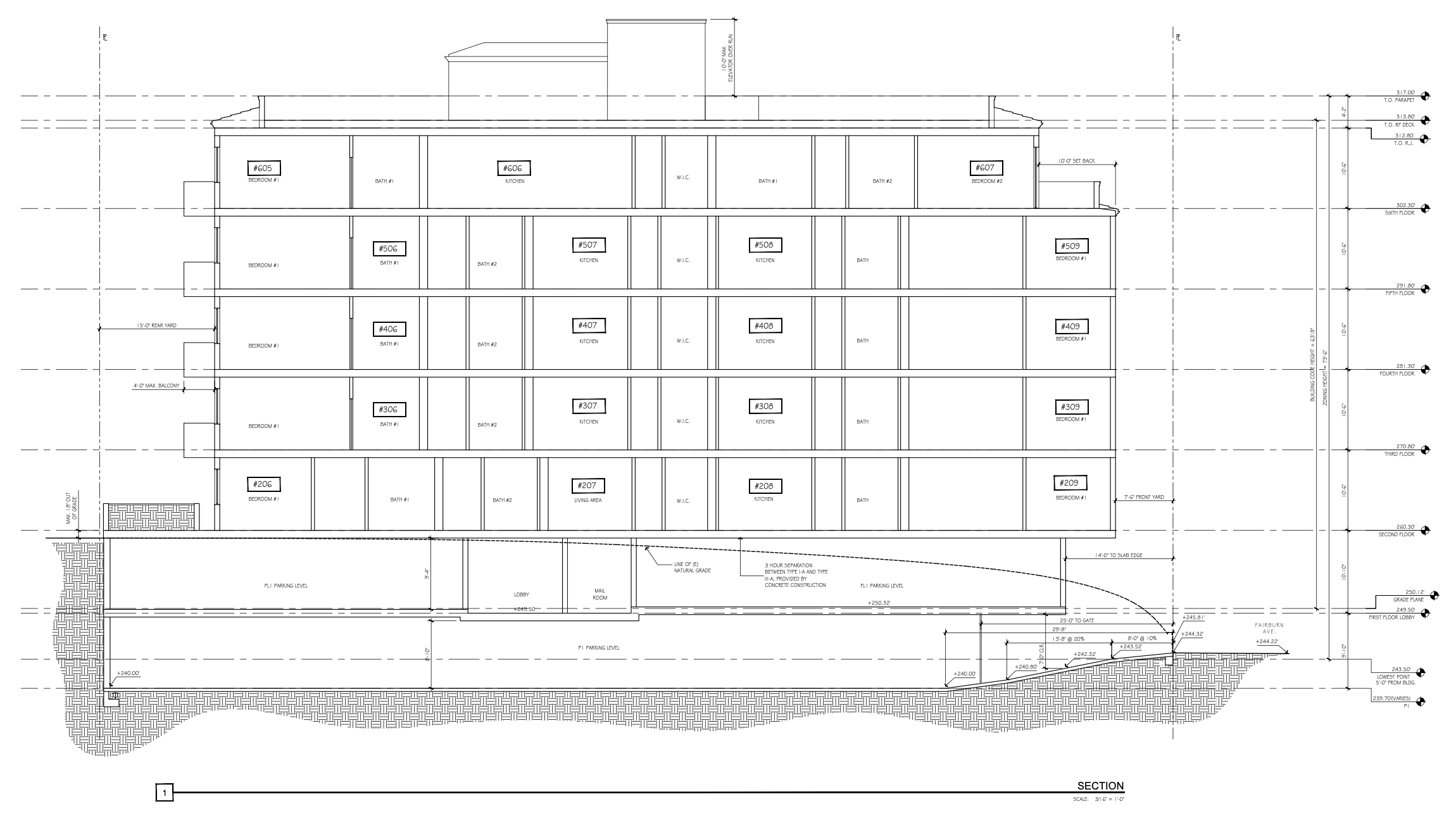 Plans depict a podium-type structure with five levels of Type III-A construction above one level of Type I-A parking. The proposal is currently under review by city planning officials.