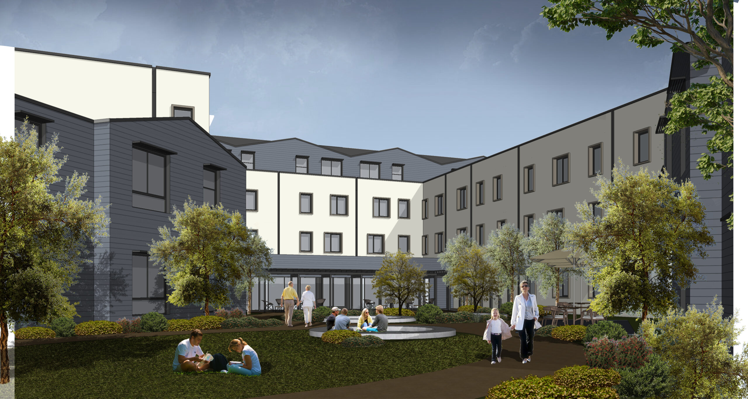 Designed by KFA Architecture, the new construction spans four levels and sits above a single-level subterranean parking garage with 78 vehicle stalls. The building is shaped around two large interior courtyards, with landscaped pathways and passive recreation zones framed by trees and native planting. The E-shaped footprint maximizes natural light to each wing of the structure while preserving private open space for residents.