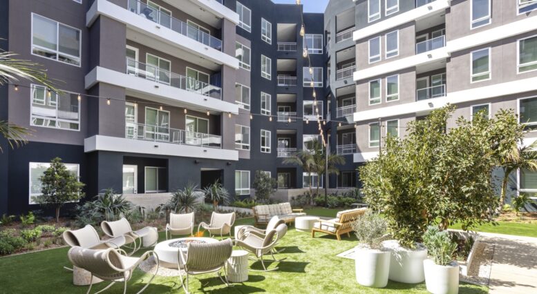 Cloud House also leans into remote‑work culture. The first floor hosts a coworking lounge with private phone pods, a conference table, and a golf simulator—amenities Bonanni added after tenant surveys at its sister property in Anaheim showed WFH demand outstripping gym time. Two landscaped courtyards at grade give pets and children protected play zones away from traffic on the state highway.