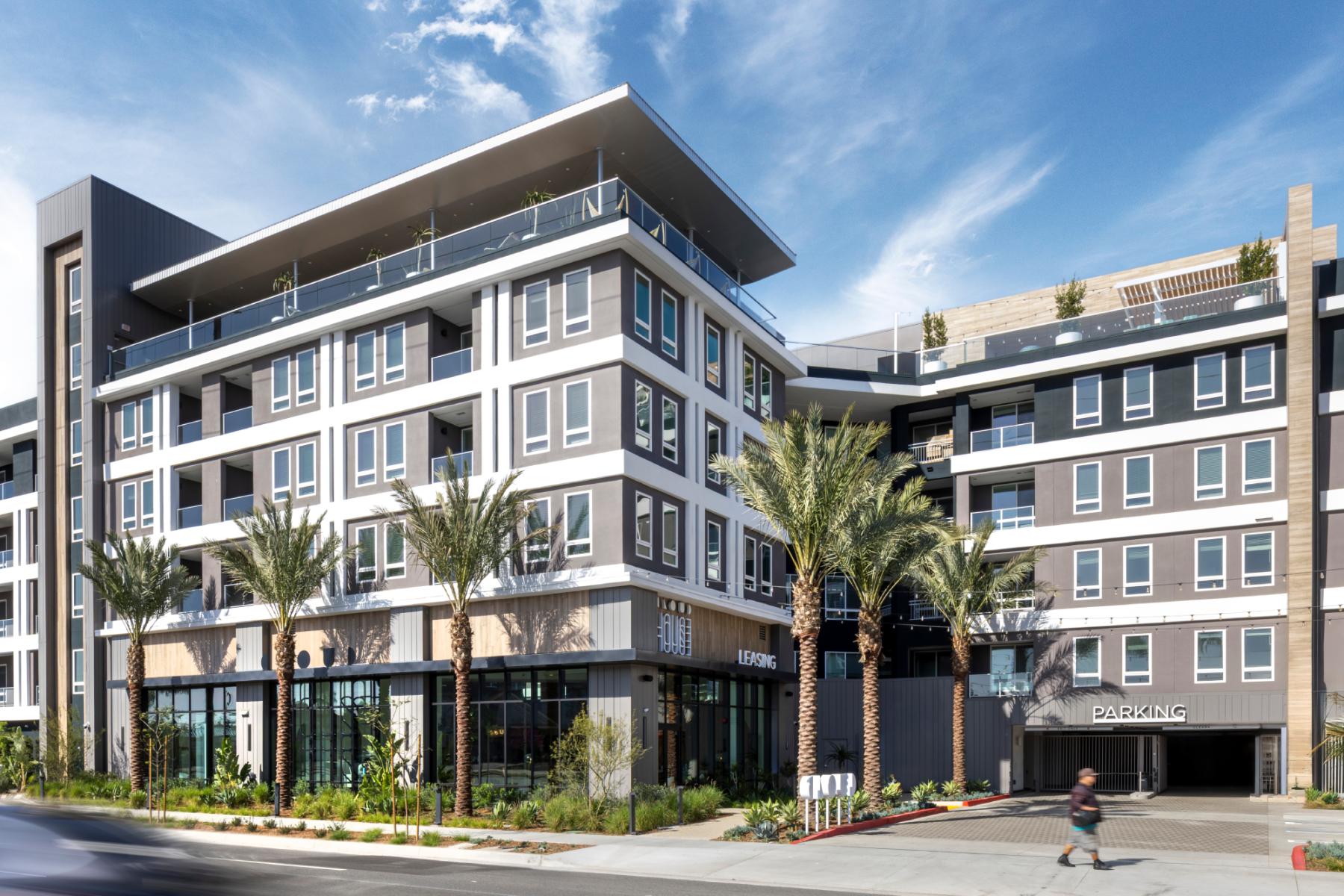 Inside, the aesthetic borrows from Orange County’s Mid‑Century Modern legacy: deep roof overhangs, rhythmically spaced columns, and linear balcony rails echo the Case Study spirit, while a double‑height glass lobby folds a greenhouse into the leasing center to soften the boulevard frontage. Residents can choose from studios, one‑bedrooms, and dual‑aspect two‑bedrooms; corner units feature floor‑to‑ceiling glazing that frames the project’s interior courtyards.